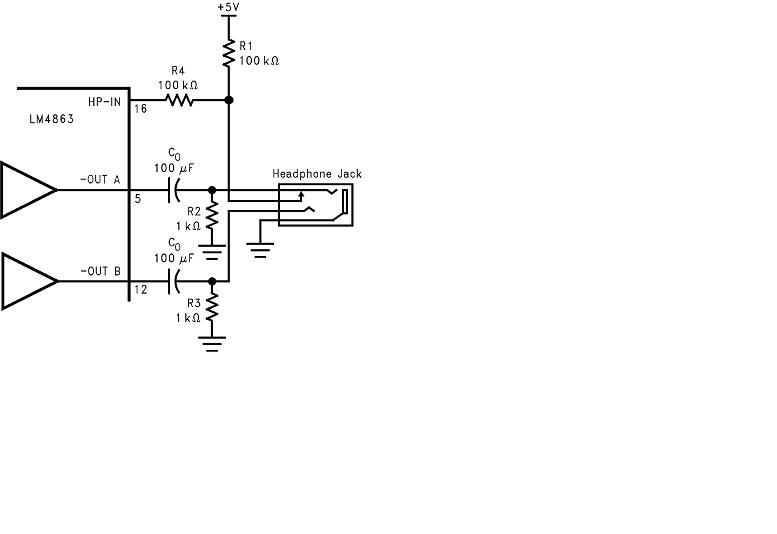 LM4863能在不使用HP-IN管腳的情況下驅(qū)動(dòng)一對(duì)橋式8Ω的揚(yáng)聲器和一對(duì)32Ω的耳機(jī)。在這種情況下,HP-IN管腳將不會(huì)連接到耳機(jī)的插孔而是連接到微處理器或是開(kāi)關(guān)。通過(guò)起用HP-IN管腳,8Ω的揚(yáng)聲器能夠被關(guān)閉。
