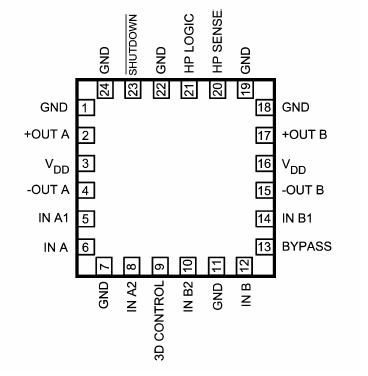 在3D CONTROL 上加高電平將激活3D 效應(yīng),同時(shí)會(huì)引起增益的增大,倍增因數(shù)是(1 +20kΩ/R5)。如設(shè)R5 值為20kΩ,則3D效應(yīng)激活時(shí)會(huì)導(dǎo)致增益增大到原來(lái)的(1 + 20kΩ/R5)2 倍或6dB。可感知的3D 量還與其它許多因素有關(guān)比如揚(yáng)聲器的位置以及離收聽(tīng)者的距離。因此使用者在應(yīng)用中可以嘗試多種R5 和C3D 的搭配來(lái)獲得最佳的3D 效果,3D 效果沒(méi)有好壞之分,對(duì)于每一個(gè)用戶個(gè)體只有適合與不適合之分。同時(shí)注意,當(dāng)3D 啟動(dòng)時(shí),R3 和R4 代替了R2,R6 和R7 代替了R8。