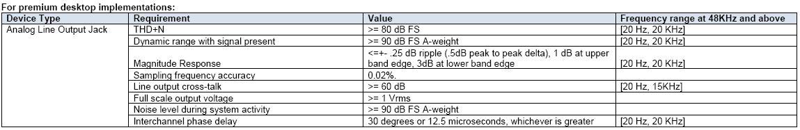 Microsoft 于2007年6月1日開始強(qiáng)制要求系統(tǒng)廠商如果想要拿到Vista 的Logo,就必須通過Windows Logo Program(WLP3.0X)中針對聲音質(zhì)量的規(guī)范SYSFUND-0118(Premium),SYSFUND-0127(Basic)。因此業(yè)界首次有了針對電子/計(jì)算機(jī)產(chǎn)品訂下聲音質(zhì)量的標(biāo)準(zhǔn)規(guī)范,也因?yàn)镸icrosoft在產(chǎn)業(yè)的領(lǐng)導(dǎo)地位使其能成為廠商愿意配合和改進(jìn)產(chǎn)品質(zhì)量的聲音規(guī)范。