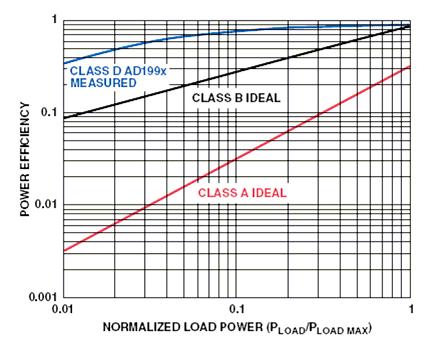 下圖為A類、B 類和 D類放大器輸出級(jí)的功率效率比較。