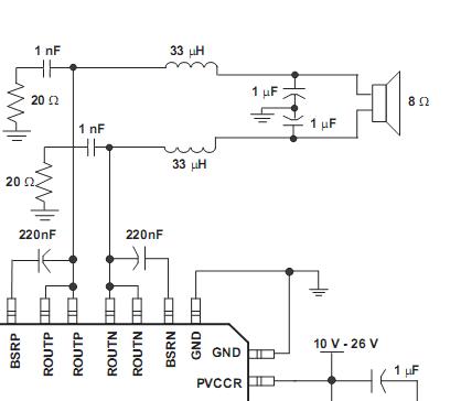 開關(guān)晶體輸出的是脈寬調(diào)制波形,在20kHz頻率以上有很寬的頻譜,為保護(hù)揚(yáng)聲器、保障功放重放有用信號(hào)的效率及EMI的需要,在功放的輸出端需加如下圖所示的20kHz低通濾波器以將開關(guān)脈沖信號(hào)還原為原始音頻信號(hào)。電路中電感損耗應(yīng)盡可能小,最大允許電流要選用正確,使其在最大電流時(shí)電感磁芯不能處于磁飽和狀態(tài),以保障功放的輸出阻抗、諧波失真、高頻雜訊性能。