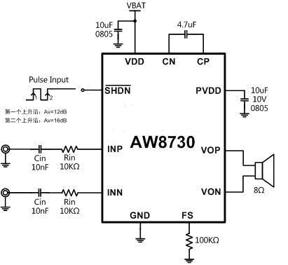 AW8730采用一線脈沖方式控制,一線脈沖控制有兩個狀態(tài),狀態(tài)1的增益為12dB,沒有防破音功能;狀態(tài)2的增益為16dB,開啟防破音功能。完善的保護功能有效防止芯片在異常工作狀況下?lián)p壞;只需少量的外圍應(yīng)用元件,適合便攜產(chǎn)品應(yīng)用。