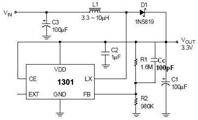 1.5V(單節(jié)堿性干電池)DC/DC升壓至3.3V,100mA輸出電流(PT1301/AX1301典型MP3應(yīng)用)