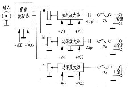 為了改變這種情況,產(chǎn)生了多通道放大器方式。在前置放大器之后用有源濾波器分割頻帶,各頻段有自己的功率放大器和揚聲器,各頻段的電平在各功率放大器之前用電位器調(diào)整。這種方式的優(yōu)點是顯而易見的,它取消了前述LC網(wǎng)絡(luò),又能有效地利用各個揚聲器的效率;同時,也降低了對功率放大器的頻率要求,輸出功率也可以小一些;這種結(jié)構(gòu)示于圖1。其關(guān)鍵電路是有源濾波器。