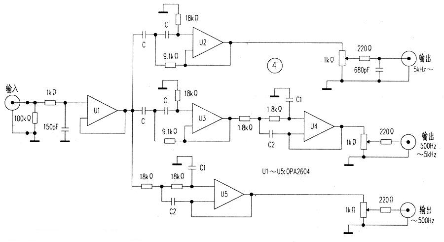 圖4是一款音頻用12分貝三通道電子分頻器的原理圖。選用多通道前級分頻比在功率放大器后分頻更能獲得良好的音質(zhì)。三通道分頻的頻率范圍分別是低頻~500Hz;中頻500Hz~5kHz;高頻5kHz~。它們合成的頻率特性示于圖5。