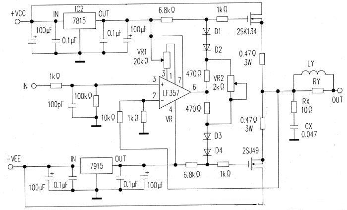 三路濾波器的輸出信號分別接至相同的三個功率放大器,其電路示于圖6。首先用輸入級為FET的運放LF357作電流緩沖,末級功放管采用高頻特性好的MOSFET,偏置電路用二極管和電阻構(gòu)成,利用半可變電阻VR2設(shè)置靜態(tài)電流,靜態(tài)電流的測定可在無信號時測量源級電阻(0.47Ω)兩端電壓,然后利用公式I=U/R算出。末級負(fù)反饋從MOSFET的源極加到運放的反相端。由于用作驅(qū)動的運算放大器的電源電壓不能過高,限制了功放的最大輸出。如運放電源電壓為±15V,驅(qū)動級最大輸出電壓為±12V=24V,揚聲器阻抗RL=8Ω.則末級最大輸出功率P=Vcc×(Vcc/8RL)=24×24/64=9W。這個功率似乎偏小,但實際上這只是一個頻段的輸出功率,加上另外兩個頻段的輸出功率,已完全適用。