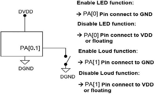 2. Loud控制功能位于PIN PA[1],當(dāng)PA[1]接地表示Loud功能開啟(音量調(diào)整最后三階開放),空接或接VDD則Loud功能關(guān)閉。