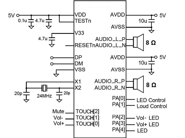 該芯片主要用于USB音箱,這種音箱不需要額外的電源線、音頻線、驅(qū)動程序,只需一根USB線與主機(jī)連接即可播放音樂,音質(zhì)可滿足普通大眾用戶需求,方便快捷。同時該芯片最大特點是內(nèi)置觸控通道及LED燈控制,單芯片就可以很容易的實現(xiàn)炫酷的觸摸方式調(diào)音,降低了觸控開發(fā)的難度和產(chǎn)品成本。管教兼容TP6902