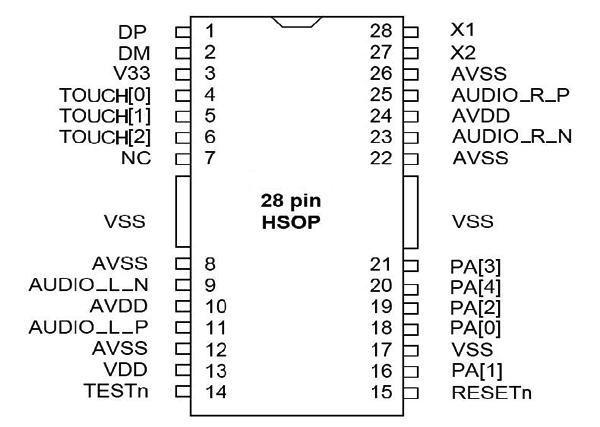 1. LED控制功能位于PIN PA[0],當(dāng)PA[0]接地表示播放音樂時LED為閃爍功能,空接或接VDD則LED恒亮。