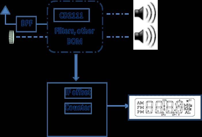 傳統(tǒng)模擬收音機(jī)IC可以用于輪調(diào)數(shù)顯收音機(jī)設(shè)計(jì)。然而,由于AM/FM接收器模擬架構(gòu)的局限性,信號(hào)處理主要由芯片外的其他元件完成,因此接收器IC需要較高的BOM成本。此外,由于模擬IC并不能為顯示驅(qū)動(dòng)器提供調(diào)諧頻率信息,在這些傳統(tǒng)的收音機(jī)方案中,需要一個(gè)中頻(IF)計(jì)數(shù)器IC通過(guò)本地振蕩器脈沖來(lái)估算調(diào)諧頻率并傳輸給顯示驅(qū)動(dòng)器,由顯示驅(qū)動(dòng)器顯示所計(jì)算出的調(diào)諧頻率,如圖2所示。