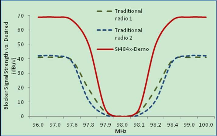 圖5顯示了Si484x系列產(chǎn)品與傳統(tǒng)方案相比所具有的卓越選擇性。其選擇性數(shù)值為阻塞器干擾預(yù)期接收信號(hào)所需的最低δ值。