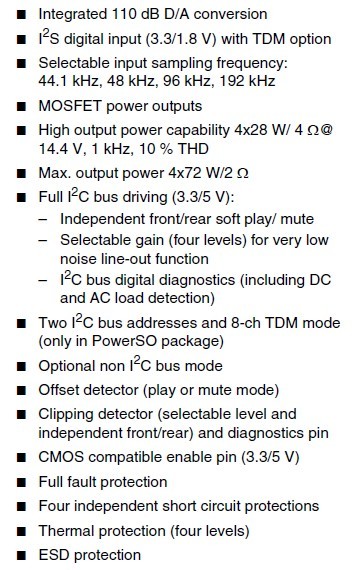作為業(yè)內(nèi)首款車用數(shù)字輸入音頻放大器芯片,意法半導(dǎo)體的TDA7801迎合汽車未來朝向純數(shù)字主機和和音響系統(tǒng)發(fā)展的趨勢。與現(xiàn)有的基于模擬輸入和數(shù)模轉(zhuǎn)換器的解決方案相比,創(chuàng)新的TDA7801具有更多的優(yōu)點。
