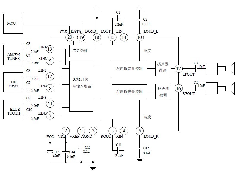 CSC2316 內置三選一輸入選擇、3V-9V寬電壓立體聲I2C電子音量控制器IC應用參考