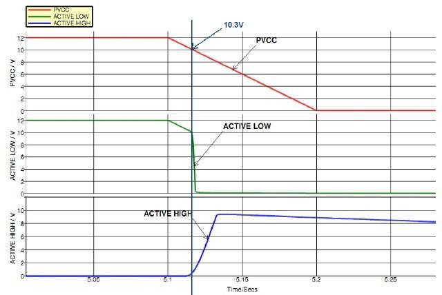 該例中,PVCC 為12V, Vf 和Veb 為0.7V, 則掉電保護(hù)點(diǎn)約在10.3V 左右,與波形圖8 吻合。