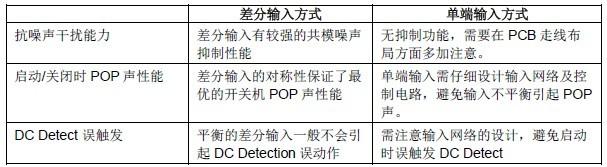 TPA3110 器件的模擬輸入是標(biāo)準(zhǔn)的差分輸入接口。在系統(tǒng)設(shè)計中,推薦使用差分輸入方式來接駁主芯片的音頻輸出。使用差分輸入方式可以不僅POP 聲的控制相對簡單、信號抗干擾能力強(qiáng),而且不會引起DC Detection 功能的誤動作。差分輸入方式和單端輸入方式的對比如下表所示:
