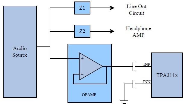 在某些系統(tǒng)中,主芯片的音頻信號輸出不僅需要連接到功放輸入,還要輸出到Line Out(線路輸出),或者其他的芯片進(jìn)行處理。該種情況下輸入級的網(wǎng)絡(luò)比較復(fù)雜,單端輸入模式的阻抗匹配不容易實(shí)現(xiàn)。為了解決這個問題,可以使用運(yùn)放接成一個簡單的跟隨器來建立一個隔離的阻抗輸