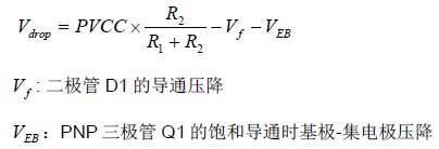 掉電檢測電路在正常供電時PVCC 會通過二極管D1 和電阻R1 向C1 大電容充電。掉電初期,Q1 的基極電壓將隨著PVCC 的跌落降低,直到跌落到Q1 三極管打開后,C1 的電壓將通過Q1送給Q2 的基極,Q2 導(dǎo)通,/SD 被拉低。根據(jù)上述原理,可由以下計算出電壓跌落的位置Vdrop: