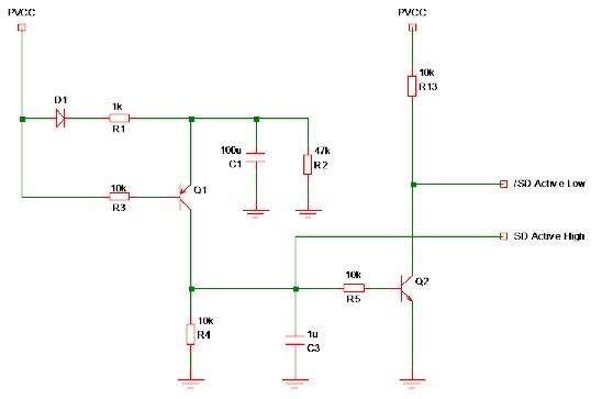 但是通常TPA3110 的PVCC 取自于系統(tǒng)的主電源,該電源一般在開機(jī)后最先輸出。隨后再通過DC/DC 或LDO 降壓給主芯片供電。所以TPA3110 一般在主芯片穩(wěn)定前已經(jīng)供電并啟動。這種設(shè)計中,上電時必須保證TPA311x 的/SD 腳處于拉低狀態(tài),避免主芯片上電過程中的POP 聲輸出。掉電時,也需要將TPA3110 置于standby 狀態(tài),避免主芯片掉電時的POP 聲輸出。通常上電過程的POP 聲較容易解決,但系統(tǒng)掉電時需要使用掉電檢測電路來強(qiáng)制將TPA3110 的/SD 快速拉低來解決掉電POP 聲的問題。
