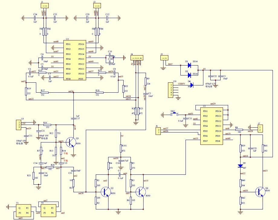 MCU主要用來控制開關(guān)機,電流電壓及音頻信號的檢測,功放IC用來放大音頻信號。