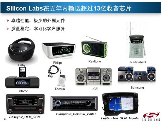 Silicon Labs針對收音機市場擁有三條產(chǎn)品線,分別是:針對消費類輪調(diào)收音機市場的Si48xx系列;針對消費類數(shù)調(diào)收音機市場的Si470x/1x/2x/3x系列;以及針對車載類收音機市場的Si474x/5x/6x系列。