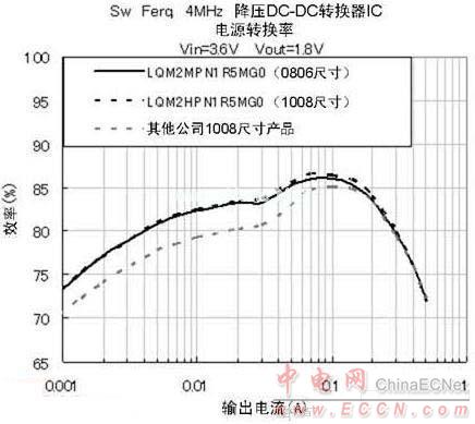 DC-DC轉(zhuǎn)換器的電源轉(zhuǎn)換效率和功率電感性能之間的關(guān)聯(lián)如圖3所示。PFM是指手機(jī)在待機(jī)狀態(tài)下保持低電流負(fù)荷的模式,這時(shí)電源轉(zhuǎn)換效率性能是與功率電感的Rac(交流電阻)以及電流-感值偏執(zhí)特性相關(guān)。圖4當(dāng)中顯示了各功率電感的Rac特性以及圖5中開關(guān)頻率數(shù)是4MHz的DC-DC轉(zhuǎn)換器IC的電源轉(zhuǎn)換效率特性。如同圖4中顯示的Rac特性,LQM系列產(chǎn)品能夠充分抑制Rac.同時(shí),圖2的電流-感值偏執(zhí)特性中顯示,它在電流通電時(shí)也能確保高感值,擁有良好的電力變換效率特性。這些性能能夠?qū)崿F(xiàn)手機(jī)在待機(jī)狀態(tài)下的高電力變換效率,對(duì)延長(zhǎng)電池壽命做出貢獻(xiàn)。