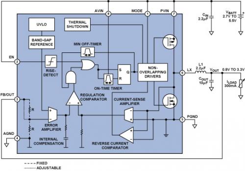 ADP2102高速同步開(kāi)關(guān)轉(zhuǎn)換器在由2.7V~5.5V的電池電壓供電時(shí),可以使內(nèi)核電壓低到0.8 V。其恒定導(dǎo)通時(shí)間的電流模式控制以及3MHz開(kāi)關(guān)頻率提供了優(yōu)良的動(dòng)態(tài)響應(yīng)、非常高的效率和出色的源調(diào)整率和負(fù)載調(diào)整率。較高的開(kāi)關(guān)頻率允許系統(tǒng)使用超 小型多層電感和陶瓷電容器。ADP2102采用3 mm×3 mm LFCSP封裝,節(jié)約了空間,僅需要三或四個(gè)外部元件。而且ADP2102包括完善的功能,諸如各種安全特征,如欠壓閉鎖、短路保護(hù)和過(guò)熱保護(hù)。