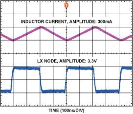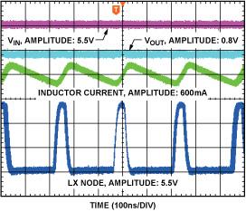 圖2示出了不同條件下的典型波形。圖2a示出了在ILOAD=600mA,電壓從VIN=5.5V減小到VOUT=0.8V時(shí)的低占空比。如圖中所示,在3MHz的開(kāi)關(guān)頻率下,可以獲得45 ns的最小導(dǎo)通時(shí)間。
