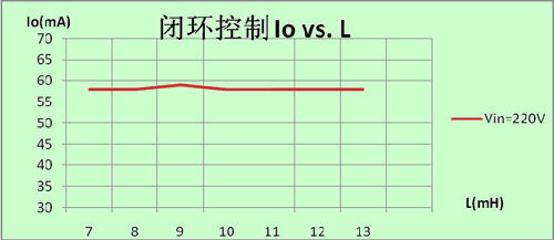 圖4可見,線性調(diào)整率為0,因?yàn)槿]環(huán)控制逐周期精確控制,輸入有任何變化,芯片會馬上檢測到并作相關(guān)的調(diào)整以便得到同樣的輸出;同理,如圖5及圖6,當(dāng)輸出電壓變化,電感量變化時(shí),芯片也會作相關(guān)的調(diào)整;正是因?yàn)槲覀兊娜]環(huán)高精度恒流控制方法,使電源做到了真正的恒流。這樣,量產(chǎn)的一致性可以控制到小于±1%。