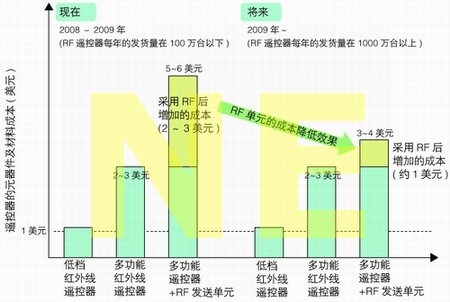在RF遙控器發(fā)貨量不大的情況下,RF收發(fā)器也難以依靠量產(chǎn)降低成本,所以,RF遙控器的元器件及材料成本將居高不下。據(jù)某遙控器生產(chǎn)廠(chǎng)商的工程師推測(cè):“RF遙控器的元器件及材料成本暫時(shí)是多功能紅外線(xiàn)遙控器的元器件及材料成本的2倍~3倍(見(jiàn)圖4)。”