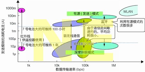 在藍(lán)牙2.1+EDR標(biāo)準(zhǔn)中,修改的不是物理層,而是MAC層的控制信號(hào)協(xié)議。藍(lán)牙消耗電流大的原因,并不是在待機(jī)或發(fā)送時(shí)的消耗電流的絕對(duì)值特別大。藍(lán)牙中深度休眠模式下的消耗電流只有10mA左右,和IEEE 802.15.4標(biāo)準(zhǔn)并沒(méi)有太大差別(見(jiàn)圖6)。