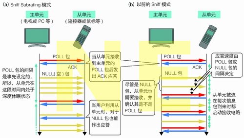新的藍(lán)牙標(biāo)準(zhǔn)把用于連接確認(rèn)的檢測(cè)(POLL)包與其它的信息包明確區(qū)別開(kāi)來(lái),并規(guī)定從單元對(duì)POLL包以外的信息包可以保持深度休眠模式。據(jù)藍(lán)牙SIG介紹,這樣一來(lái),消耗電流的平均值就會(huì)下降到以前的1/5以下。而且,延遲時(shí)間不會(huì)變長(zhǎng)。