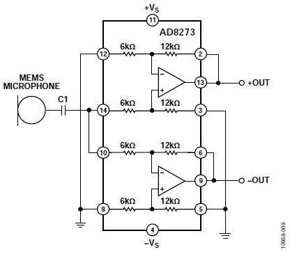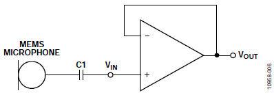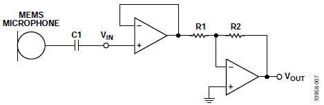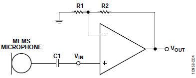 單個(gè)運(yùn)算放大器可以簡(jiǎn)單地作為MEMS麥克風(fēng)輸出的前置放大器應(yīng)用于電路中。MEMS麥克風(fēng)是一個(gè)單端輸出設(shè)備,因此單個(gè)運(yùn)算放大器級(jí)可用于為麥克風(fēng)信號(hào)增加增益或僅用于緩沖輸出。