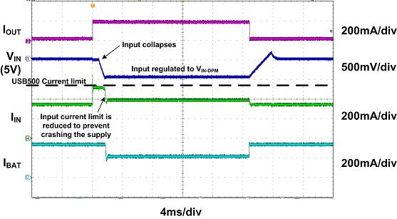 VIN-DPM 通過(guò)限制輸入電流阻止脈沖發(fā)生,從而防止輸入源崩潰。圖5 顯示了超負(fù)載USB 端口的結(jié)果。VIN-DPM 功能開始生效,降低輸入電流限制,從而防止輸入源崩潰。