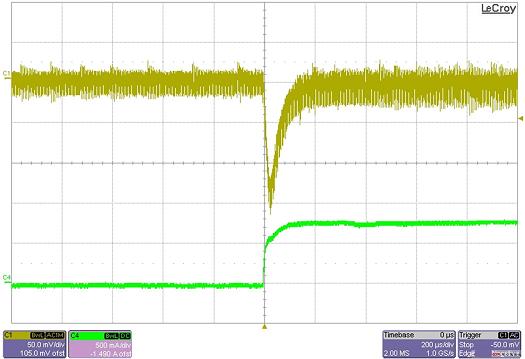 圖 2 顯示了輸出電流 700 mA 階躍變化的兩個(gè)瞬態(tài)負(fù)載響應(yīng)。左邊的線跡為連續(xù)情況,而右邊的線跡則為非連續(xù)情況。在非連續(xù)情況下,瞬態(tài)響應(yīng)比連續(xù)情況差了三倍多。同步 FET 用于強(qiáng)制連續(xù)運(yùn)行。但是,也有一些獲得較好瞬態(tài)響應(yīng)的其他方法,包括預(yù)加載輸出或者使用擺動(dòng)電感等。擺動(dòng)電感用于在低電流時(shí)增加電感。這個(gè)目標(biāo)的實(shí)現(xiàn),主要是通過兩種磁心材料:低電流飽和高鐵氧體,以及低電流不飽和粉末鐵氧體。