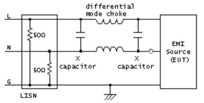 電容的作用是將高頻干擾電壓“短路”,另外,當(dāng)干擾信號頻率很高時,抑制線圈將產(chǎn)生很大的交流阻抗。圖2顯示了兩種濾波類型的結(jié)構(gòu),其中,LISN是用于測量目的的線性阻抗穩(wěn)定網(wǎng)絡(luò)。如果是共模問題引起的干擾,X類型電容基本上沒有作用,因為兩線上的干擾電壓是一樣的。因此,了解干擾類型對于選擇合理的電路結(jié)構(gòu)將起重要作用,并為解決問題提供技術(shù)依據(jù)。
