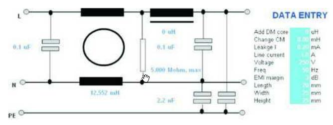 知道設(shè)備的干擾特性和輸入阻抗特性后,設(shè)計或者選擇一個濾波器就變得簡單了。如果使用一個現(xiàn)成的濾波器,可以調(diào)用過去積累的濾波器數(shù)據(jù)庫,比對濾波器參數(shù),找到一個合適的濾波器。如果沒有合適的或者想專門設(shè)計一個專用濾波器,可以借助專用的濾波器設(shè)計軟件。在確定一個濾波器模式后輸入濾波器一些簡單的約束條件,設(shè)計軟件根據(jù)阻抗特性自動計算出最合適的組件值,以及提供最合適的衰減。(如圖6所示)