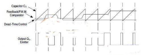 控制信號由集成電路外部輸入,一路送至死區(qū)時間比較器,一路送往誤差放大器的輸入端。死區(qū)時間比較器具有120mV的輸入補償電壓,最小輸出死區(qū)時間約等于鋸齒波周期的4%,即輸出驅(qū)動的最大占空比為96%.當(dāng)把死區(qū)時間控制輸入端接上固定的電壓(范圍在0-3.3V)即能在輸出脈沖上產(chǎn)生附加的死區(qū)時間。脈沖寬度調(diào)制比較器為誤差放大器調(diào)節(jié)輸出脈寬提供了一個手段:當(dāng)反饋電壓從0.5V變化到3.5V時,輸出的脈沖寬度從被死區(qū)確定的最大導(dǎo)通百分比時間下降到零。兩個誤差放大器具有從-0.3V到(Vcc-2.0)的共模輸入范圍,這可從電源的輸出電壓和電流察覺得到。誤差放大器的輸出端常處于高電平,它與脈沖寬度調(diào)制器的反相輸入端進行"或"運算,正是這種電路結(jié)構(gòu),放大器只需最小的輸出即可支配控制回路。