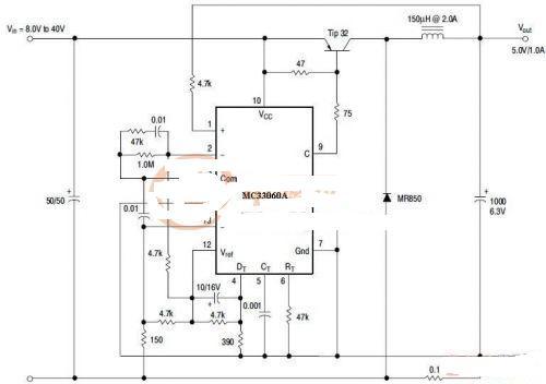 MC33060作為主控芯片控制開關(guān)管的導(dǎo)通與截止,由其內(nèi)部結(jié)構(gòu)功能可知,在MC33060內(nèi)部有一個+5V參考電壓,通常用作兩路比較器的反相參考電壓,設(shè)計中1腳和2腳的比較器用來作為輸出電壓反饋,13腳和14腳的比較器用來檢測開關(guān)管的電流是否過流。電路中2腳通過一個反相電路接參考電壓,降壓輸出反饋經(jīng)一同相電路接MC33060的1腳。當(dāng)電路處于工作狀態(tài)時,1腳和2腳電壓就會相互比較,根據(jù)兩者的差值來調(diào)整輸出波形脈寬,達到控制和穩(wěn)定輸出的目的。
