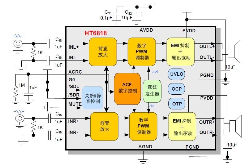此外,HT6818內(nèi)置的關(guān)斷功能使待機(jī)電流最小化,還集成了靜音功能、左右聲道獨(dú)立關(guān)斷、揚(yáng)聲器輸出端過(guò)流保護(hù)、片內(nèi)過(guò)溫保護(hù)和欠壓異常保護(hù)等功能;采用無(wú)鉛TSSOP-20及SOP-16封裝形式。
