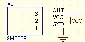 一般的紅外接收頭主要由集成電路外加阻容元件,紅外線接收管及濾波光片等組成,電路設(shè)計(jì)相對(duì)繁瑣,在實(shí)際應(yīng)用中不方便。而紅外遙控接收頭SM0038 集紅外接收管,前置放大解調(diào)等于一體,無(wú)外部電路,體積小,密封性好,靈敏度高,應(yīng)用簡(jiǎn)單,用小功率紅外發(fā)射管發(fā)射信號(hào)接收距離達(dá)35 米,并且價(jià)格低廉。它僅有三條管腳,分別是電源正極、電源負(fù)極以及信號(hào)輸出端,其工作電壓在5V 左右,接收頻率為38kHz,它的主要功能包括放大,選頻,解調(diào)幾大部分,要求輸入信號(hào)需是已經(jīng)被調(diào)制的信號(hào)。從而使電路達(dá)到最簡(jiǎn)化,靈敏度和抗干擾性都非常好,是一個(gè)接收紅外信號(hào)的理想裝置。如圖5 所示: