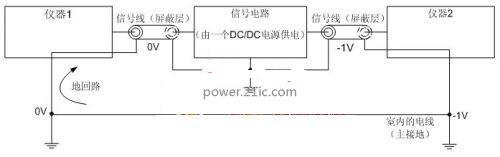 當(dāng)系統(tǒng)中的某些組件由不同的地線,而不是系統(tǒng)中其他組件供電,或系統(tǒng)中兩個(gè)電路之間對(duì)地電位不一樣時(shí),測(cè)量、通信或視頻系統(tǒng)會(huì)產(chǎn)生接地環(huán)路。通常,對(duì)地連接的電位差會(huì)造成電流流動(dòng)。這樣會(huì)調(diào)制電路輸入,正常輸入中出現(xiàn)其他信號(hào)。圖1所示例子中,兩個(gè)接地儀器通過信號(hào)線接地,以及主地線互連。這種情況下,線路中1A電流會(huì)在兩個(gè)儀器接地點(diǎn)之間形成0.1V電壓差。