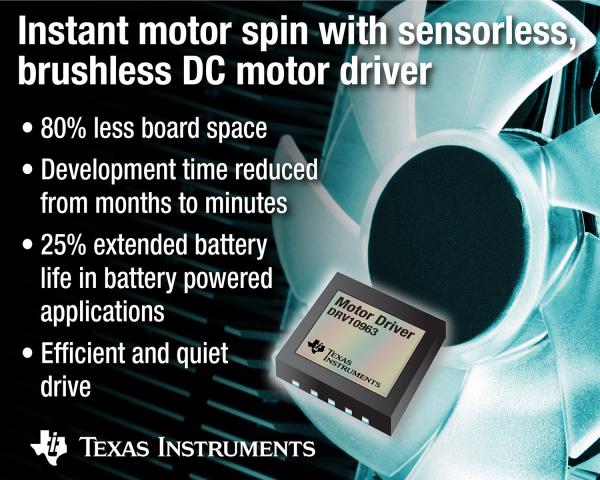DRV10963 現(xiàn)已開始供貨,采用支持裸露導(dǎo)熱焊盤的高效散熱 10 引腳、3 毫米 x 3 毫米 USON 封裝。