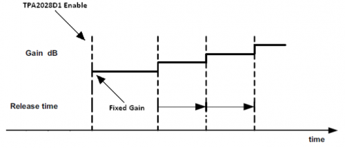 EN 和 SWS 不會清除寄存器的設定狀態(tài),所有寄存器值維持原先的設置,因此 TPA2028D1 在軟件使能之后可以按照設定的 Fixed Gain和 Max Gain以及 Release Time進行變化。如 Figure 2所示。因此只需要設置合適的 Fixed Gain, Max Gain 和 Release Time,就可以控制這種變化,從而消除 AGC和DRC帶來的淡入淡出問題。