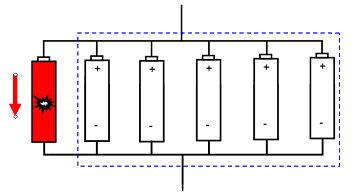 對于并聯(lián)的鋰離子動力電池模組,當其中一節(jié)或幾節(jié)電池發(fā)生內(nèi)短時,電池模組中的其他電池會對其放電,電池組的能量會使內(nèi)短電池溫度急速升高,極易誘發(fā)熱失控,最終導致電池起火爆炸。如示意圖1所示