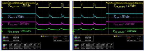 在無負(fù)載條件下,當(dāng)反激轉(zhuǎn)換器的反饋電壓下降時,PFC級的電源電壓被切斷,PFC控制器停止工作。圖2顯示負(fù)載從滿負(fù)載到無負(fù)載,再到滿負(fù)載過程 中的工作波形。一旦第二級反激轉(zhuǎn)換器進(jìn)入間歇工作,PFC級便進(jìn)入間歇工作模式,并與反激轉(zhuǎn)換器同步停止間歇工作模式。通過對PFC級執(zhí)行間歇工作,可以 消除可能引起潛在問題的大浪涌電流,并且大幅降低待機(jī)功耗。為了評測PFC級的間歇工作,使用FAN7930臨界導(dǎo)通模式PFC控制器、帶間歇工作功能的 準(zhǔn)諧振反激控制器FAN6300A以及所提議的PFC控制電路,設(shè)計(jì)了一個用于LED街燈的的120W(48V/2.5A) LEB-016演示線路板。如圖2所示,建議的電路工作出色。表1所示為在各種輸入線路電壓下的待機(jī)功耗測量值?梢宰C明:在寬泛的輸入范圍內(nèi),可以使待 機(jī)功耗降低80%以上。還可以在高線路輸入電壓下獲得低于0.3W的待機(jī)功耗。