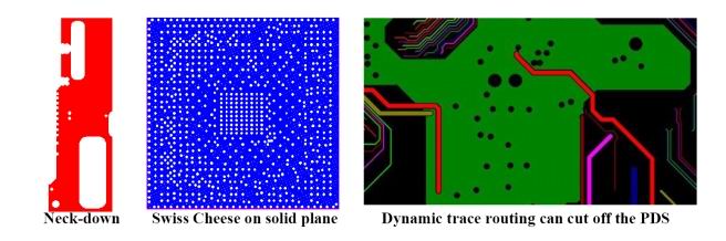 電源板層上有Swiss-Chess結(jié)構(gòu)、Neck-Down結(jié)構(gòu)和動(dòng)態(tài)布線造成的板平面被分割等情況(圖1);電源板層上電流通過(guò)的器件管腳、過(guò)孔、焊球、C4凸點(diǎn)的數(shù)量不夠,電源平板厚度不足,電流通路不均衡等;系統(tǒng)設(shè)計(jì)需要低電壓、大電流,又有較緊的電壓浮動(dòng)的范圍。