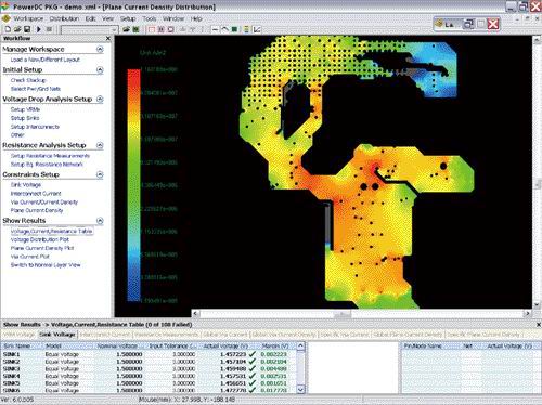 布線工程師、系統(tǒng)工程師、信號(hào)完整性工程師和電源設(shè)計(jì)工程師還可以將IR壓降分析結(jié)合在約束管理器(constraint manager)中,作為對(duì)PCB上每一個(gè)電源和地網(wǎng)表進(jìn)行設(shè)計(jì)規(guī)則核查的最終檢驗(yàn)工具(DRC)。這種通過(guò)自動(dòng)化軟件分析的設(shè)計(jì)流程可以避免靠目測(cè),甚至經(jīng)驗(yàn)所不能發(fā)現(xiàn)的復(fù)雜電源供電系統(tǒng)結(jié)構(gòu)上的布局布線問(wèn)題。圖2展示了IR壓降分析可以準(zhǔn)確地指出一高性能PCB上電源供電系統(tǒng)中關(guān)鍵電壓電流的分布。