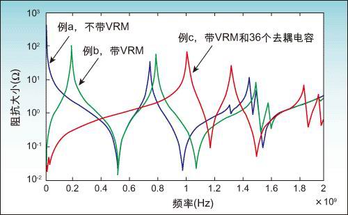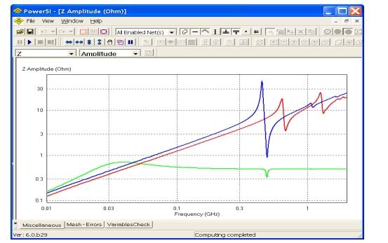 圖4顯示了在三種不同設(shè)置下,用Sigrity PowerSI計(jì)算得到的電源供電系統(tǒng)的輸入阻抗: