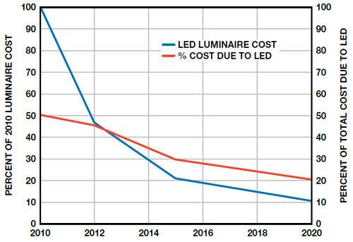 憑借使用壽命長和功耗低的優(yōu)勢,LED有望改變整個照明行業(yè),但它的快速采用面臨的主要障礙是LED本身的成本居高不下。LED燈具(完整電力照明設(shè)備)的成本各不相同,但LED的成本通常占據(jù)了整個燈具成本的大約25%至40%,而且預(yù)期在今后多年內(nèi)仍會占據(jù)很高比例(圖1)。