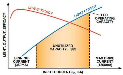 降低整體燈具成本的一種方法是在產(chǎn)品規(guī)格允許的范圍內(nèi),在可能最高的直流電流下驅(qū)動LED。此電流可能遠(yuǎn)高于其“分檔電流”。如果正常驅(qū)動,這樣可能產(chǎn)生更高的流明/成本比率。